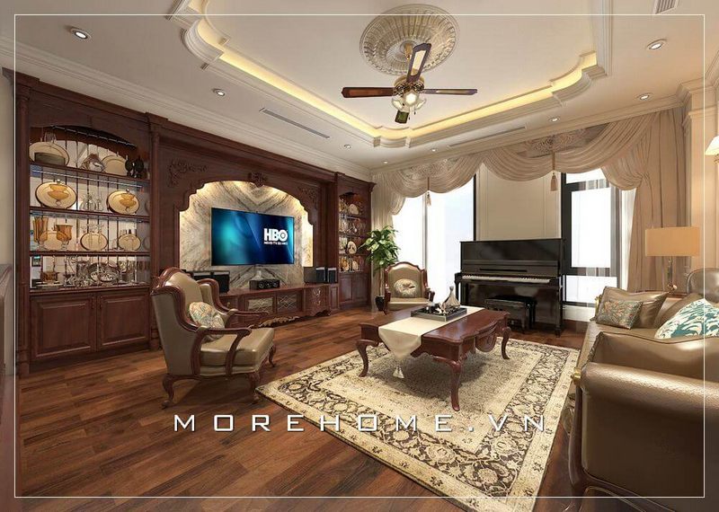 Kệ tủ tivi phòng khách kết hợp với tủ rượu và tủ trang trí bằng gỗ tự nhiên được thiết kế theo phong cách tân cổ điển mang đến sự tiện nghi và sang trọng cho không gian tiếp khách biệt thự