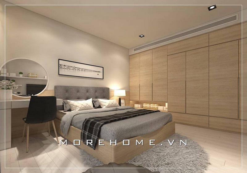 Thiết kế giường ngủ chung cư hiện đại ấn tượng với gam màu vàng gỗ nhẹ nhàng, ấm áp