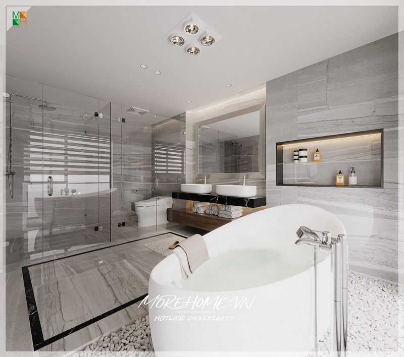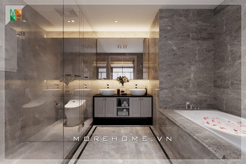 Sử dụng đồng bộ gạch lát nên và ốp tường đẹp, phòng tắm trở nên sang trọng và rất tiện nghi.