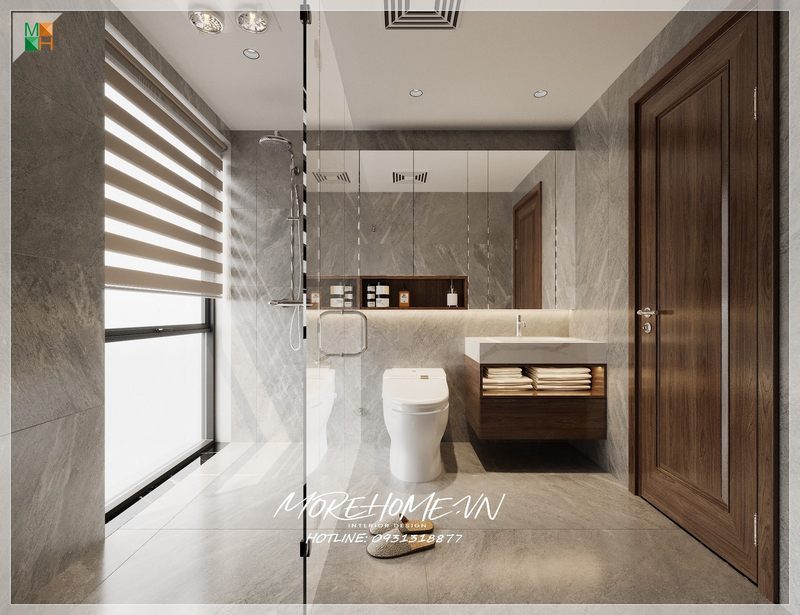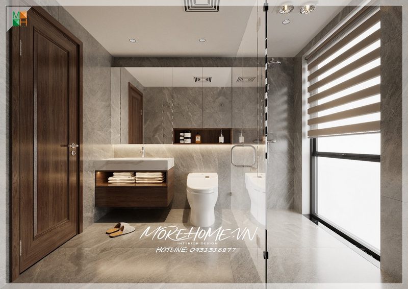Thiết kế nhà tắm chung cư sử dụng vật liệu xây dựng gạch lát nền và ốp tường bằng gạch giả vân đá màu sáng tạo không gian phòng tắm đẹp và rộng hơn.