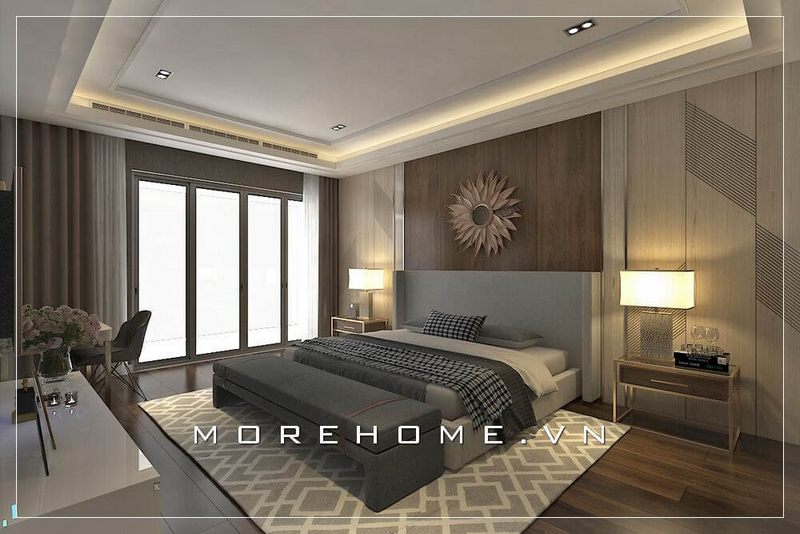 Mẫu giường ngủ Master sang trọng và đầy ấn tượng, phần đầu giường được thiết kế cách điệu mang đến cho không gian phòng ngủ thêm phần sang trọng và hoành tráng