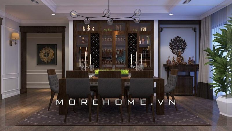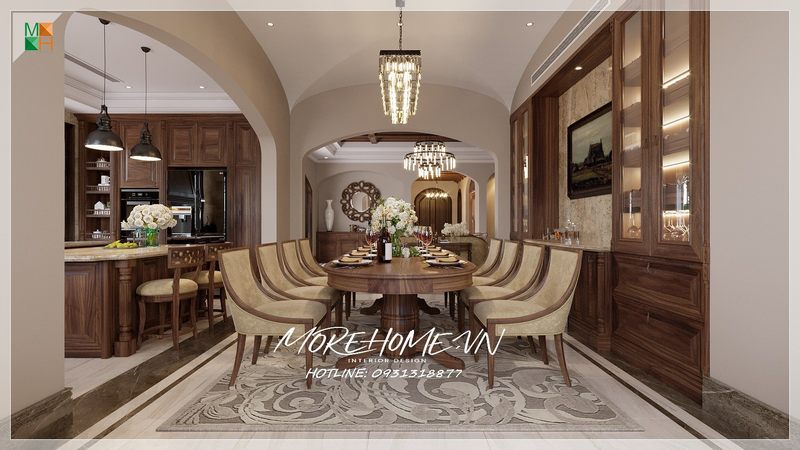 Mẫu thiết kế nội thất phòng ăn cư sang trọng theo phong cách tân cổ điển có tính lỗng lẫy và thu hút mọi ánh nhìn.