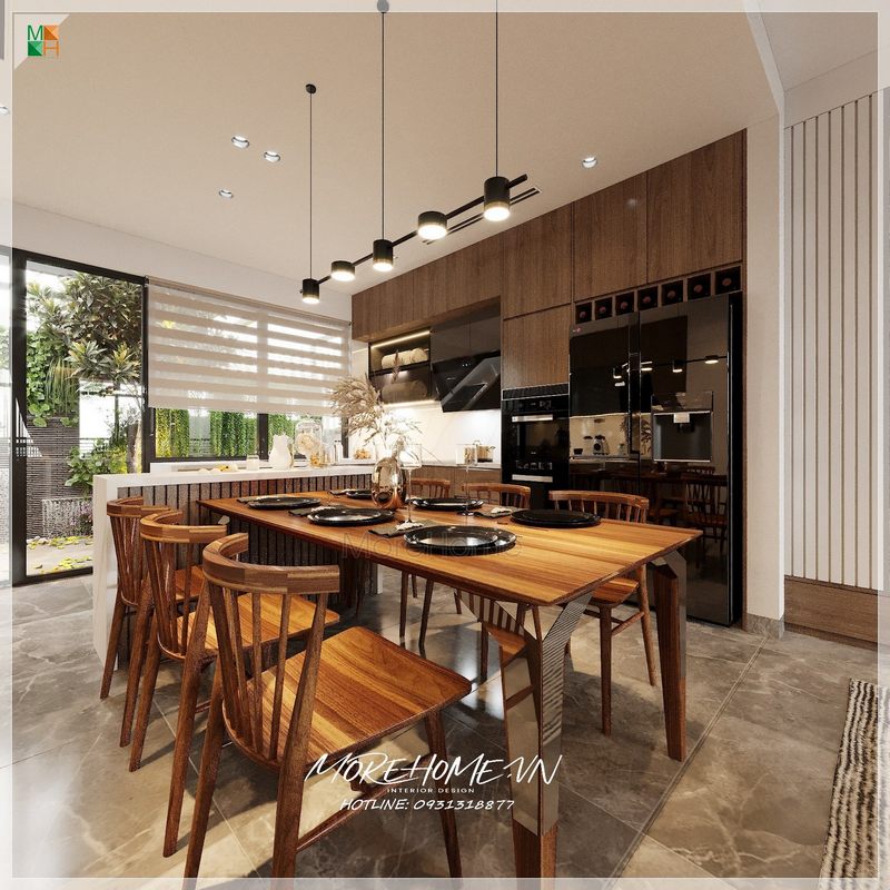 Bộ bàn ghế và tủ bếp được làm từ gỗ óc chó tự nhiên tạo nên một vẻ đẹp đồng nhất nhưng vẫn mang lại sự độc đáo trong gian bếp hiện đại.